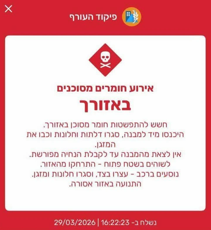 Nella zona dei bombardamenti, Israele ha emesso un avviso di emergenza, invitando la popolazione a restare in casa, chiudere finestre e porte e spegnere i condizionatori per evitare l’esposizione a materiali pericolosi.”