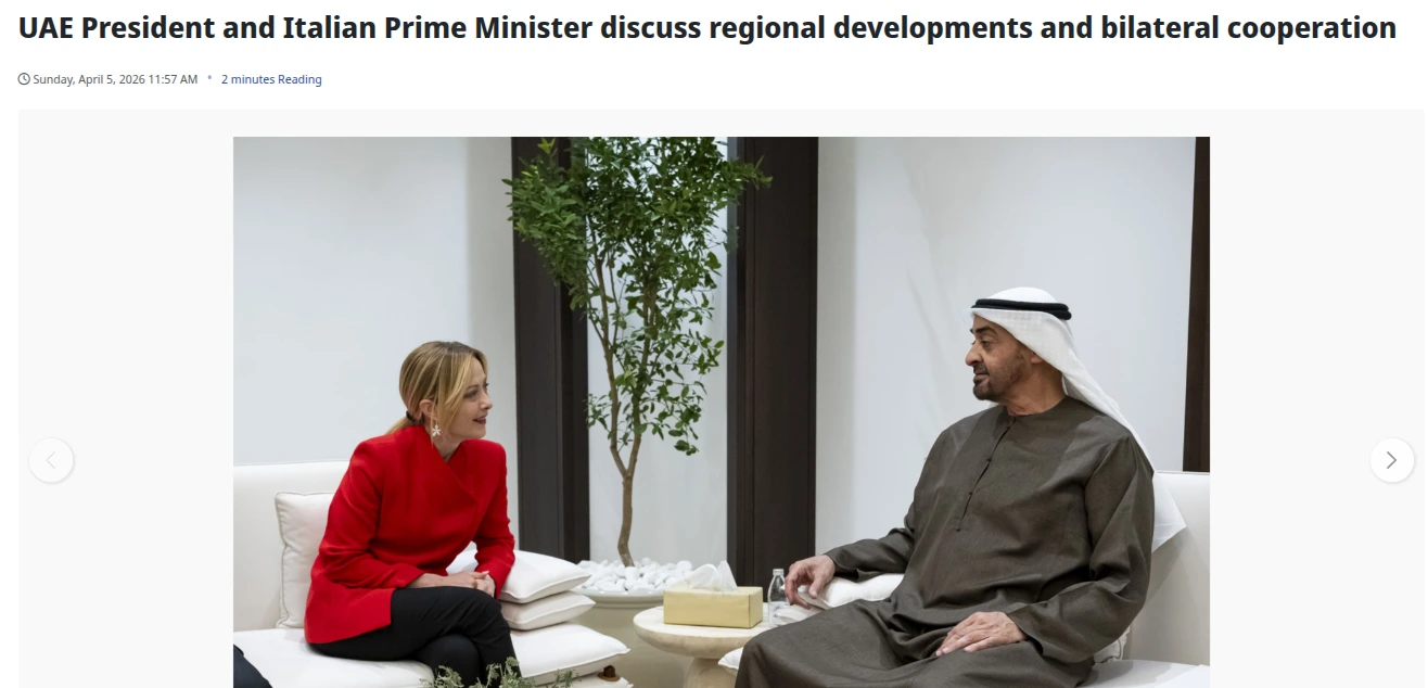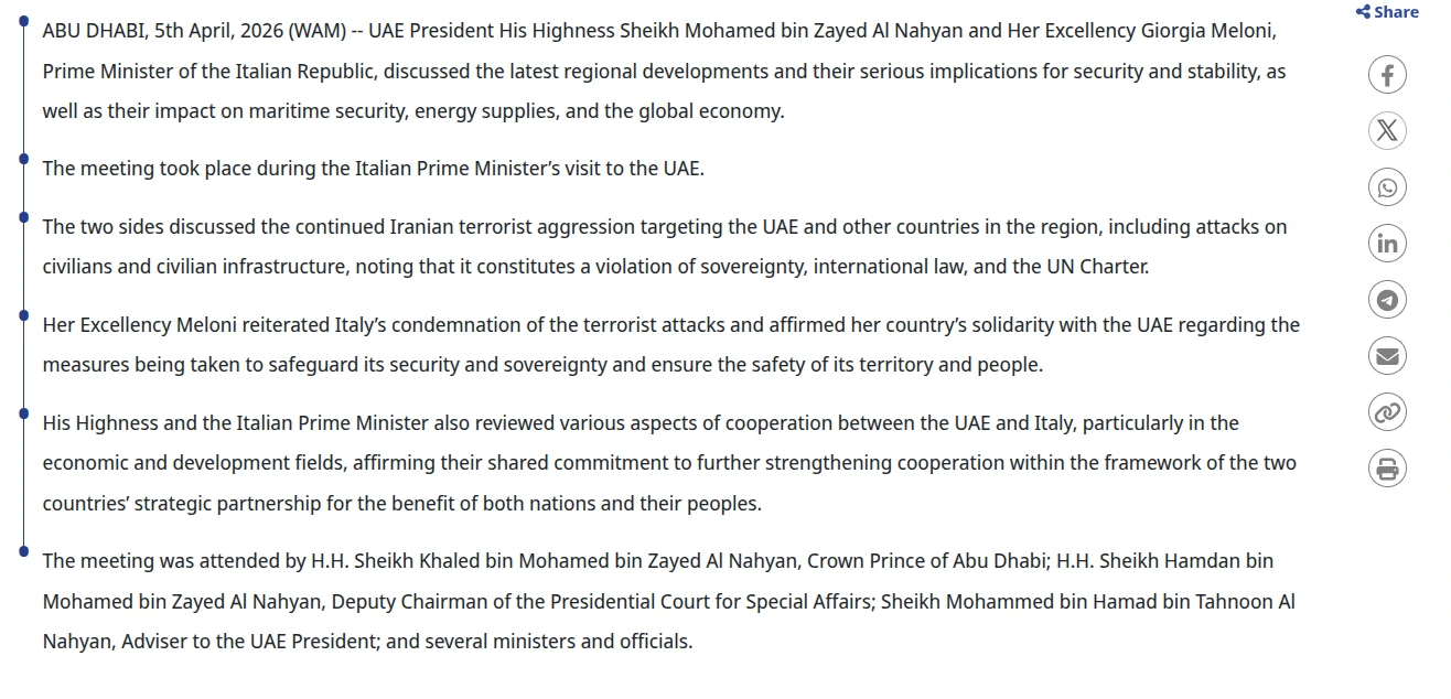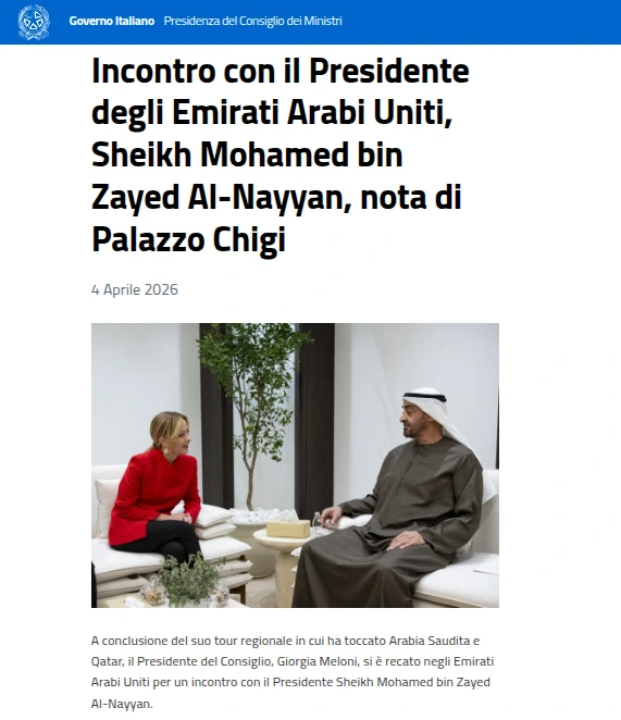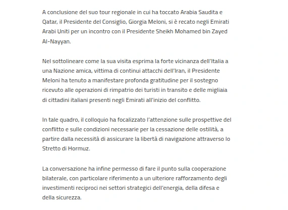 Durante la visita negli Emirati Arabi Uniti, l'agenzia di stato emiratina WAM ha pubblicato parole attribuite direttamente a Meloni — definendo gli attacchi iraniani "terroristici" e affermando la solidarietà italiana alle misure di sicurezza di Abu Dhabi. Palazzo Chigi ha pubblicato un comunicato separato. Quelle parole non compaiono. Stessa visita. Stesso incontro. Due testi ufficiali incompatibili.